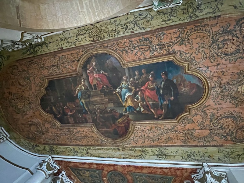 入口ホールの木製天井の細やかな装飾と絵画も印象的。