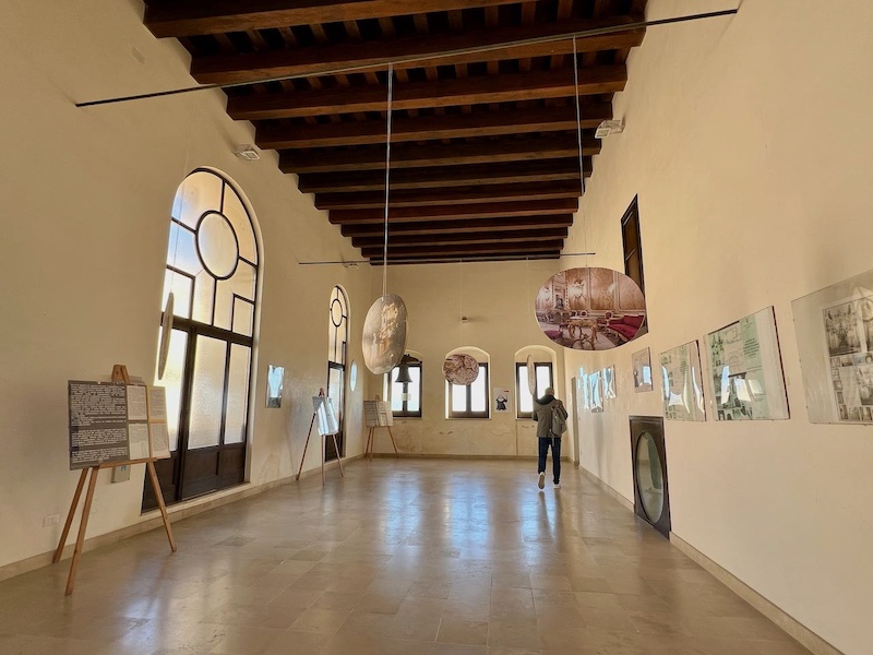 さらに上階にも部屋があり、ギャラリーとなっていました。上の写真の右側の壁の下の方にある木枠は窓になっていて、ここからも教会内部が見えます。