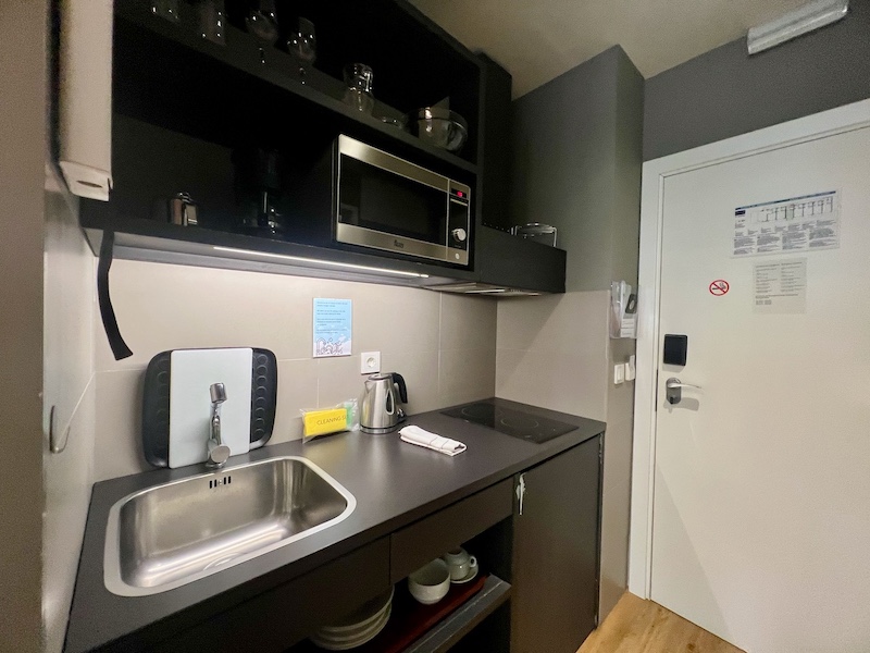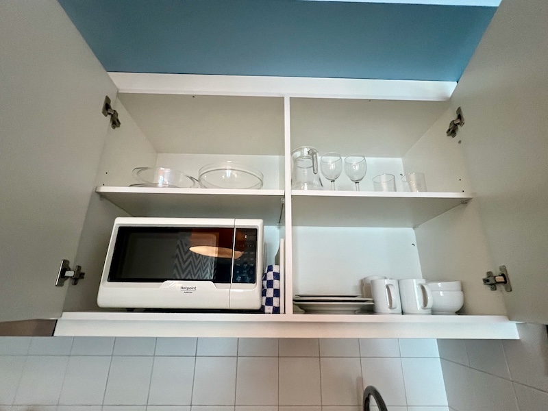 こちらもキッチン付きで、コンロ、電子レンジ、ケトル、冷蔵庫、食器類は全て揃っています。こちらには4泊したので、少し料理もしました。