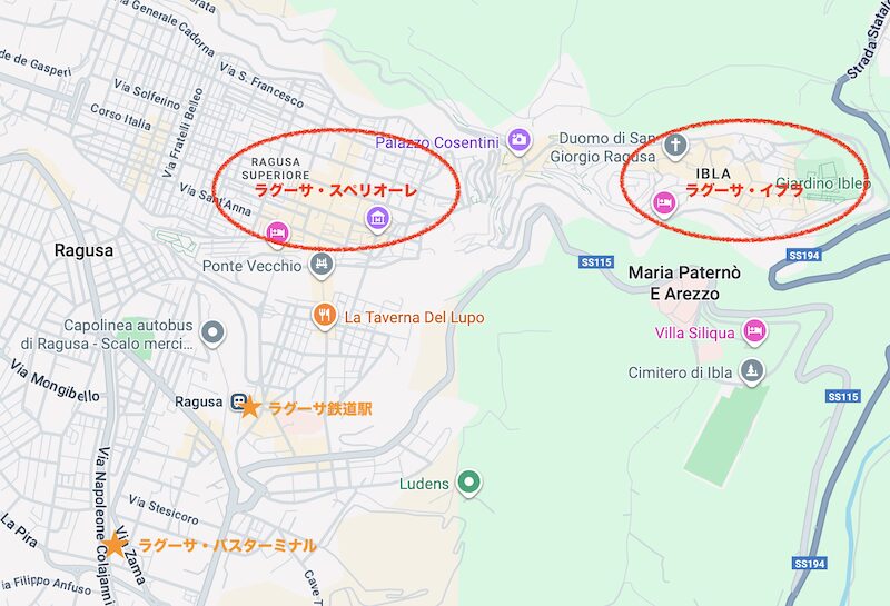 鉄道駅や長距離バスが発着するバスターミナルは、ラグーサの観光エリアからは少し離れた場所に位置しています。