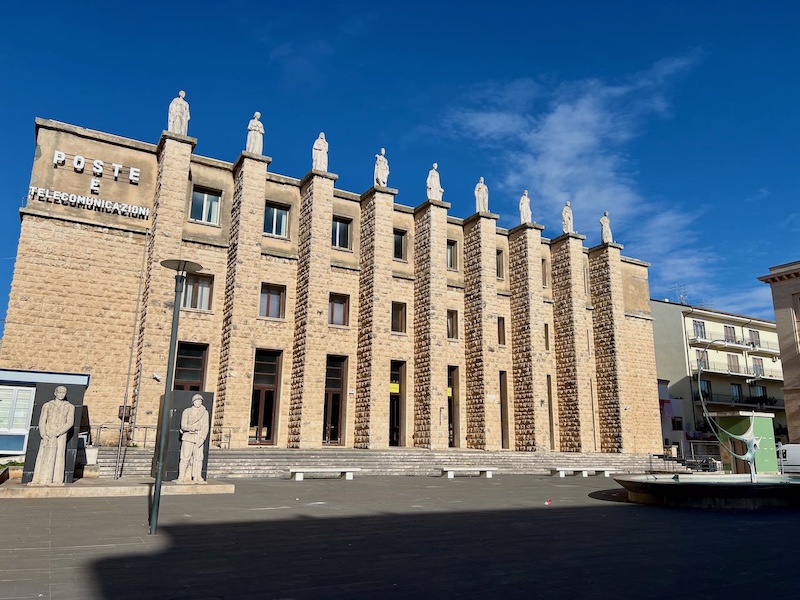 この郵便局は、イタリアの独裁者ムッソリーニ政権時代の1930年頃に建設。ファサードの9本の柱の上には、9人の彫像が据えられています。共産圏国家にありそうな厳つい建物。イタリアのファシズム時代の歴史を今に伝える建築物の一つ。