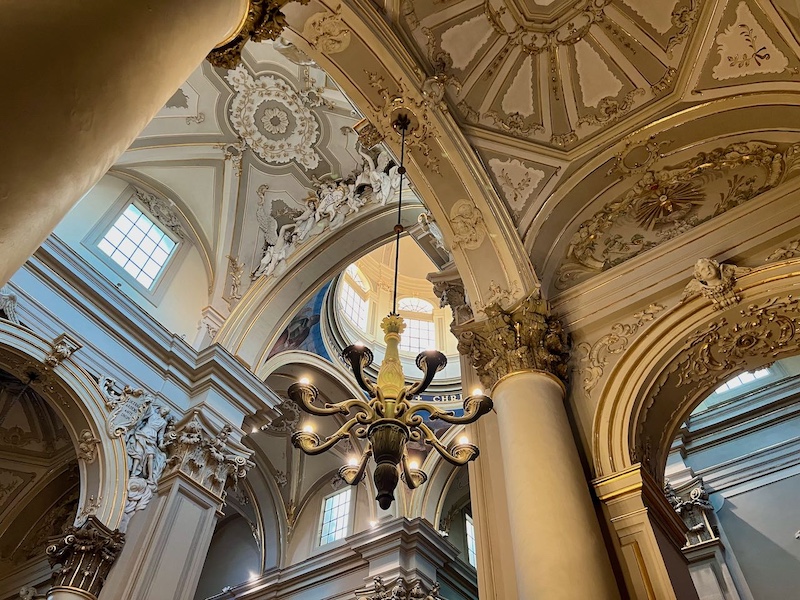 内部もヴォールトや側廊の礼拝堂の壁などにバロック装飾が施されており華やか。