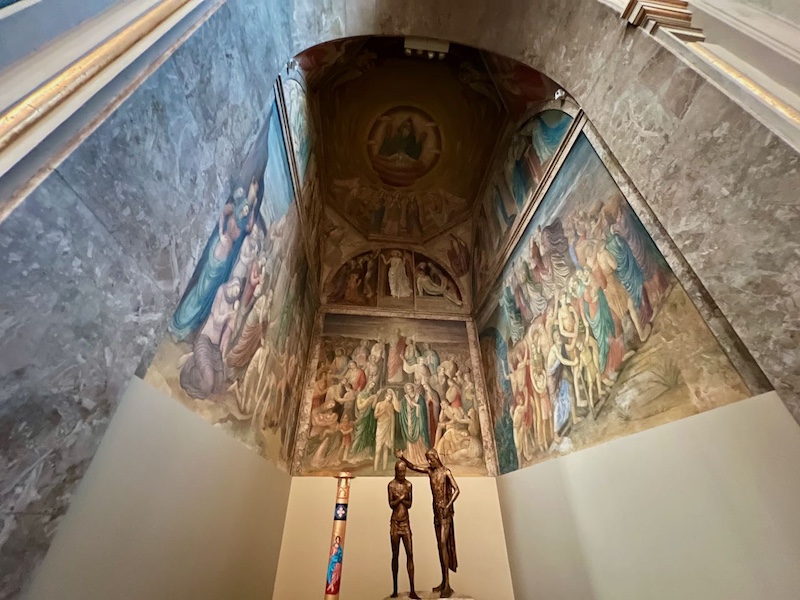 洗礼の礼拝堂。中央には、聖ヨハネから洗礼を受けるイエス・キリストのブロンズ像があります。天井には神と鳩、洗礼のシンボルを持つ天使、壁には洗礼の様子や出エジプト記が描かれています。