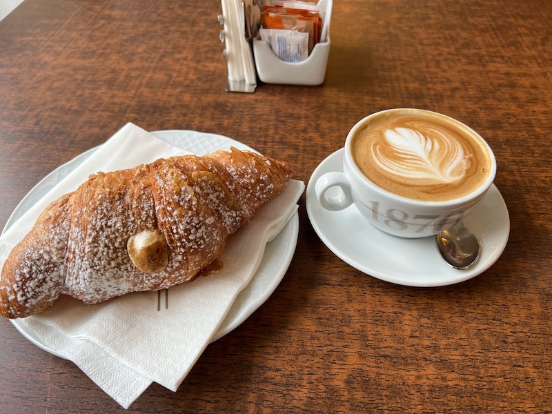 手前のカフェ・イタリアで朝食にリコッタクリームのたっぷり入ったクロワッサンとカプチーノをさくっといただきました(3.40€≒125バーツ)。観光地のど真ん中でもこの価格。バンコクのカフェだとカフェラテで120〜150バーツくらいが相場なので、シチリアのカフェは安い。