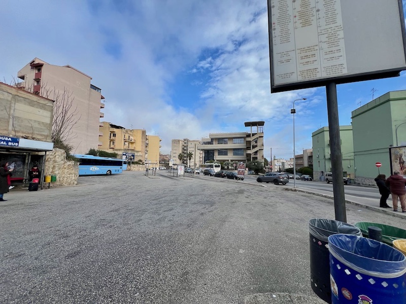 ラグーサのバスターミナルは、鉄道駅からさらに南東に1km離れたところに位置しています。私は次の目的地に行くのにバスを使うため、スペリオーレの宿泊場所から歩いて行きましたが、結構遠かったです。スーツケースもあったので、30分くらいかかりました。歩くのは苦ではないものの、凸凹道でスーツケースをゴロゴロと引くのはなかなかしんどい。
